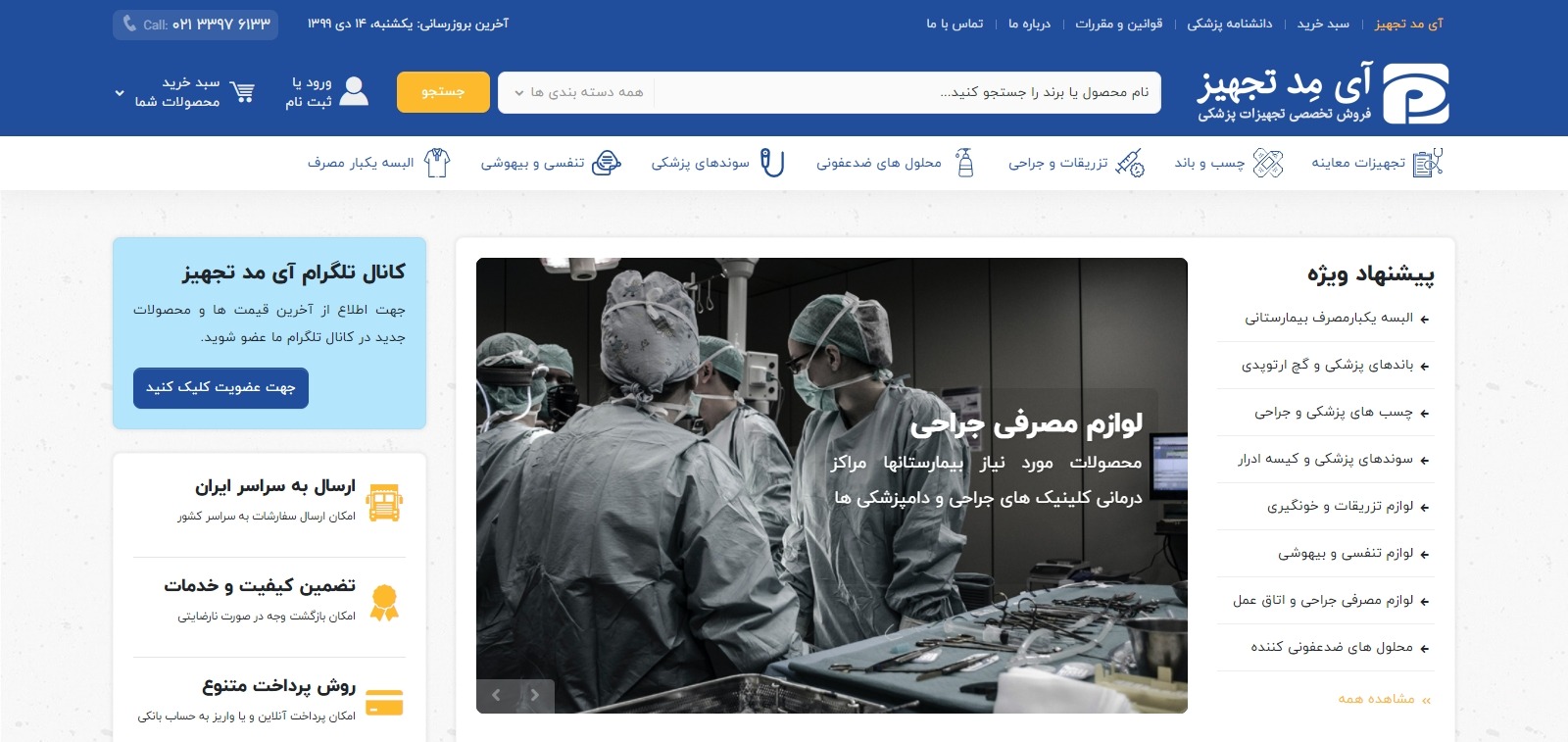 آی مد تجهیز یک وب سایت فروشگاهی با بیش از ۲۰۰ نوع محصول در زمینه تجهیزات بیمارستان و آزمایشگاهی و همچنین لوازم و البسه یکبار مصرف پزشکی فعالیت میکند. سابقه ۲۰ ساله فعالیت این شرکت برای ما بسیار حائز اهمیت بوده است و تمام تلاش خودمان را کردیم تا بهترین و جدیدترین متد روز را در طراحی و برنامه نویسی آن استفاده کنیم.