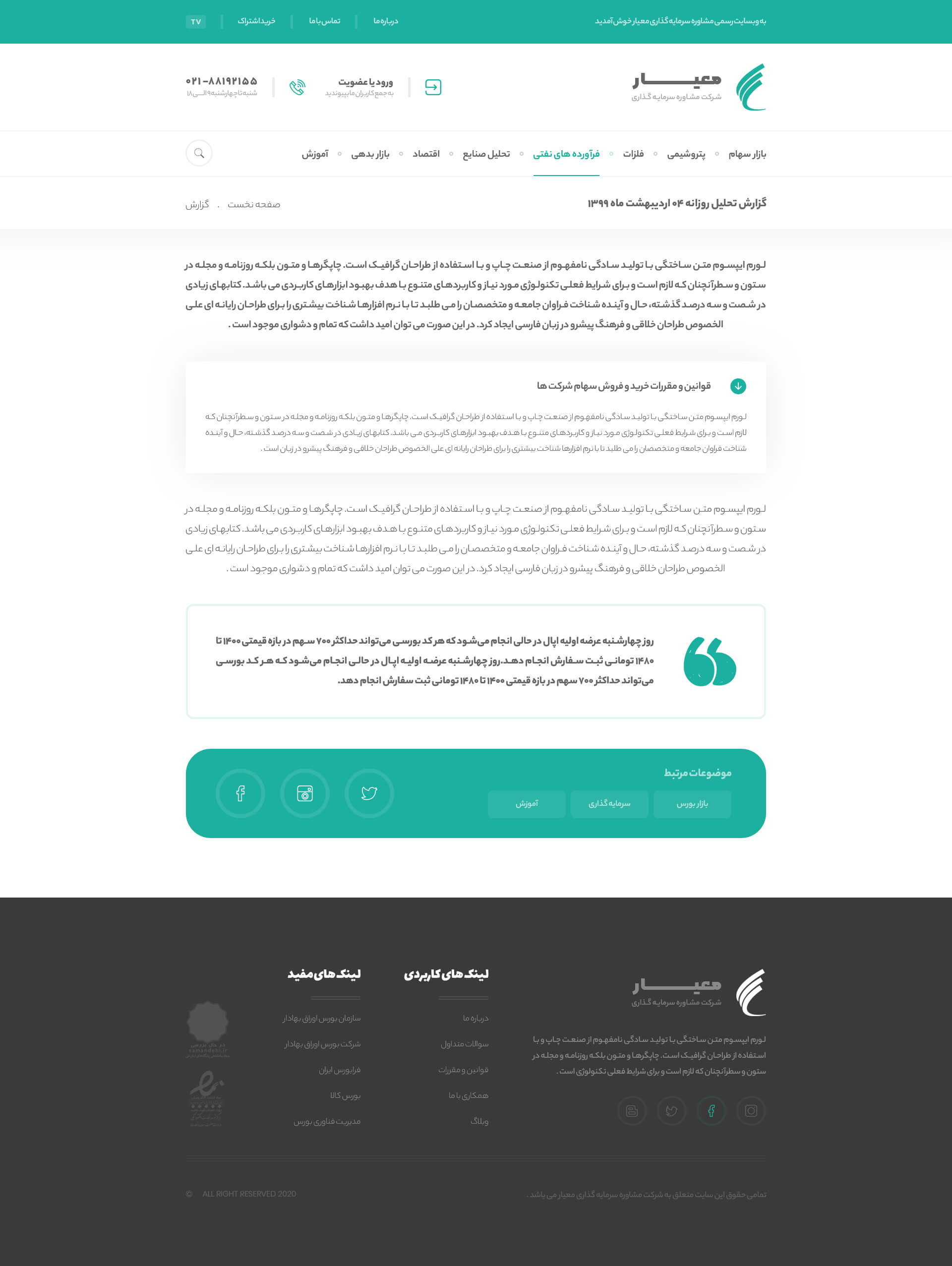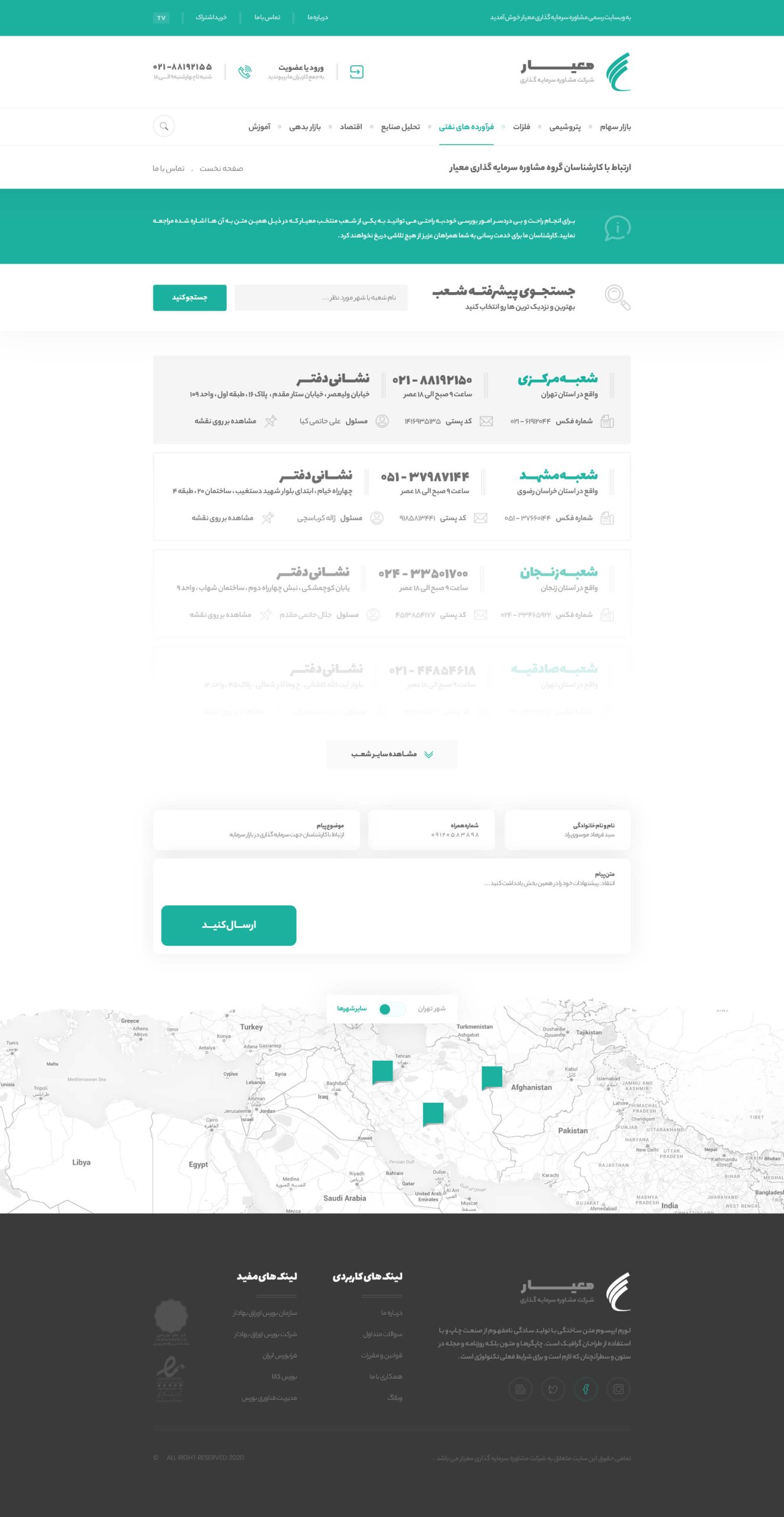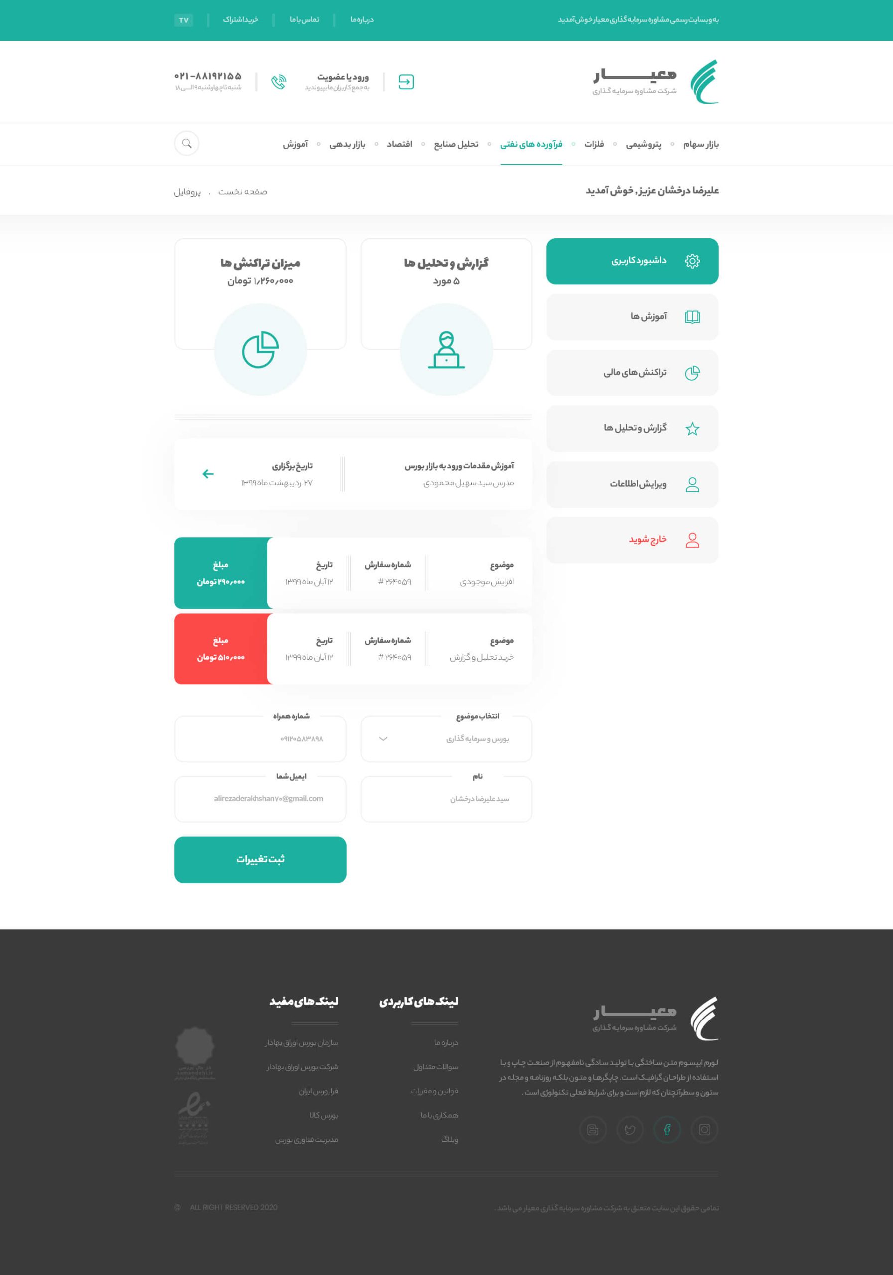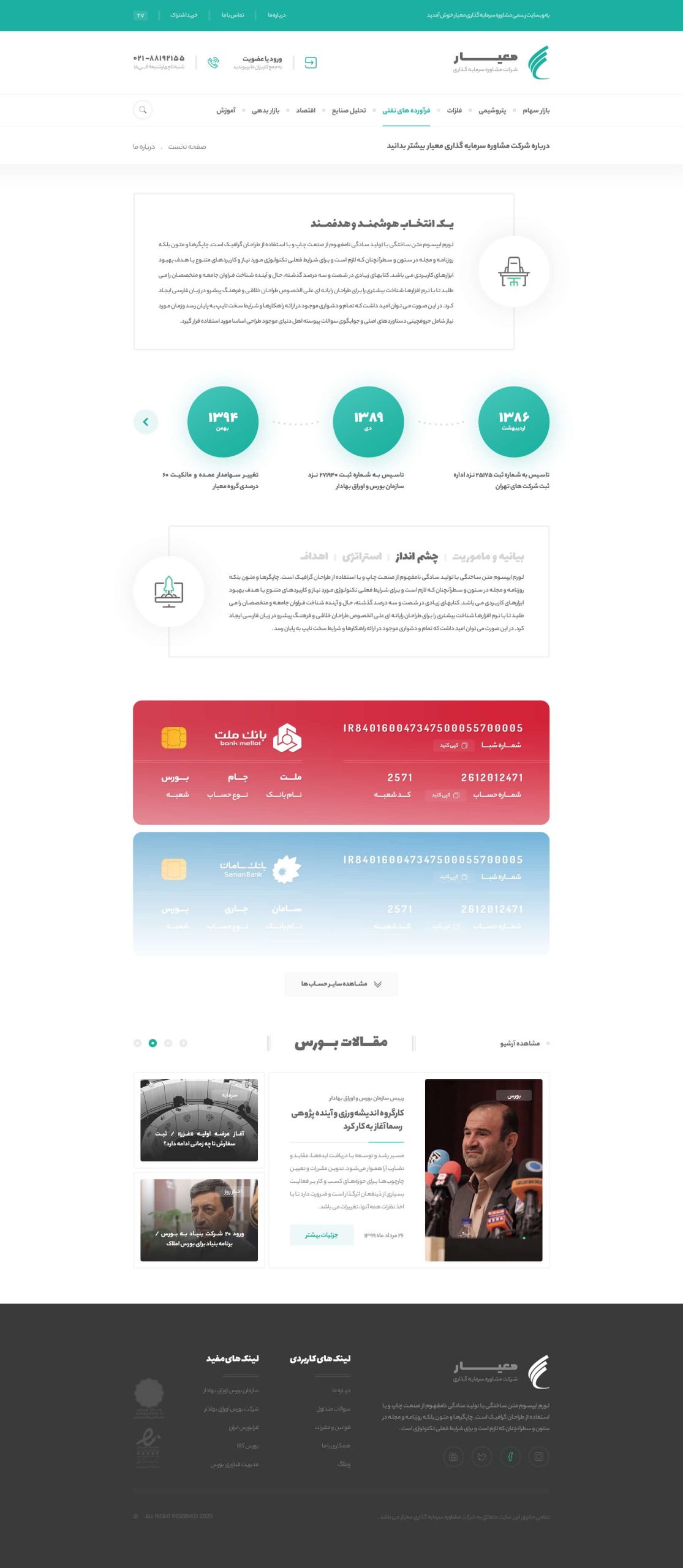 برای شرکت مشاوره سرمایهگذاری «معیار»، یک سایت اختصاصی وردپرسی طراحی شده که ترکیبی از زیبایی بصری و امکانات حرفهای مدیریت سرمایه را ارائه میدهد. در نگاه اول، طراحی صفحات اصلی، درباره ما و تماس با ما به گونهای است که اعتماد و شفافیت شرکت را به بازدیدکننده منتقل میکند و تجربه کاربری ساده و روانی برای مرور اطلاعات فراهم میآورد.